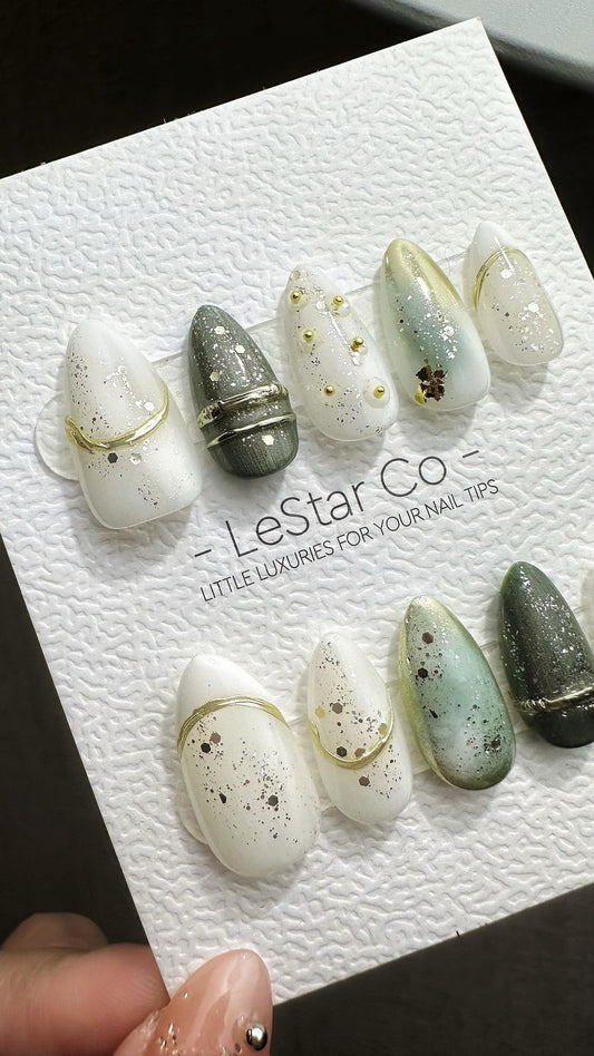 Reusable Frosted Emerald Elegance| Premium Press on Nails Gel | Fake Nails | Cute Fun Colorful Gel Nail Artist QN846