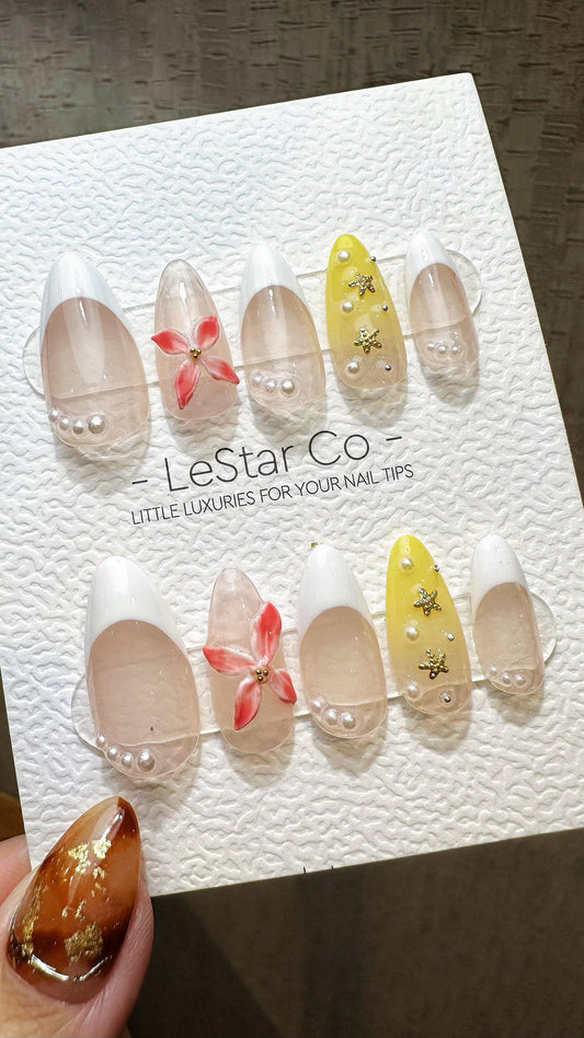 Reusable Sunshine Blossoms French Tip| Premium Press on Nails Gel Hand Painted Pressons Customizable Gel Nail Artist faux nails ML810