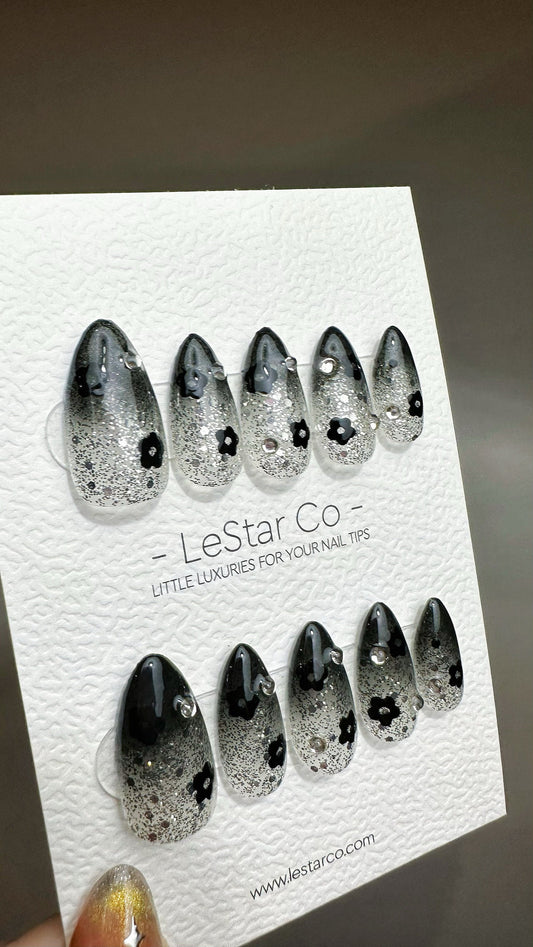 Reusable Black Flower | Premium Press on Nails Gel | Fake Nails | Cute Fun Colorful Gel Nail Artist faux nails ML622