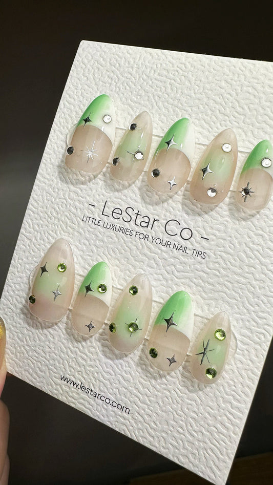 Reusable For The Best Green Star French Tip| Premium Press on Nails Gel | Fake Nails | Cute Fun Colorful Gel Nail Artist faux nails ML624