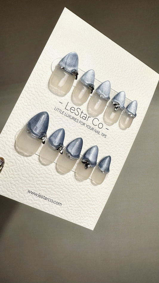 Reusable Icy Blue Butterfly French Tip Cat-Eye Effect| Premium Press on Nails Gel Manicure| Fake Nails | Handmade Gel Nail faux nails QN756