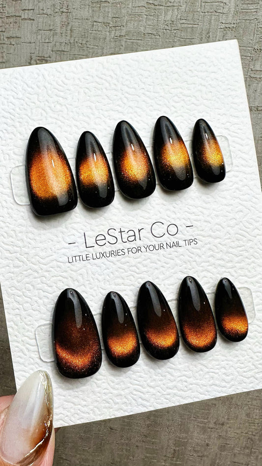 Reusable Molten Glow Orange Cat Eye Effect |Premium Presson Nails Gel Manicure Hand Painted Pressons Handmade | Lestarco faux nails ML898
