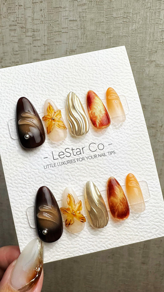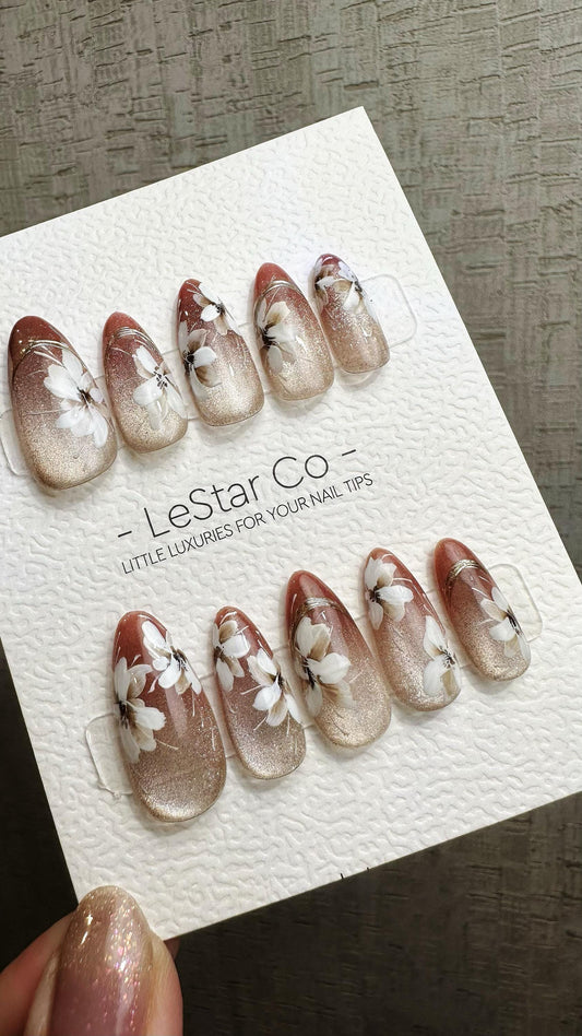 Reusable Autumn Blossom Glow Cat Eye Effect | Premium Press on Nails Gel Hand Painted Pressons Customizable Gel Nail Artist faux nails QN956