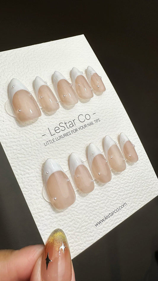 Reusable French Tip with Pearl | Premium Press on Nails Gel | Fake Nails | Cute Fun Colorful Gel Nail Artist faux nails TMR597