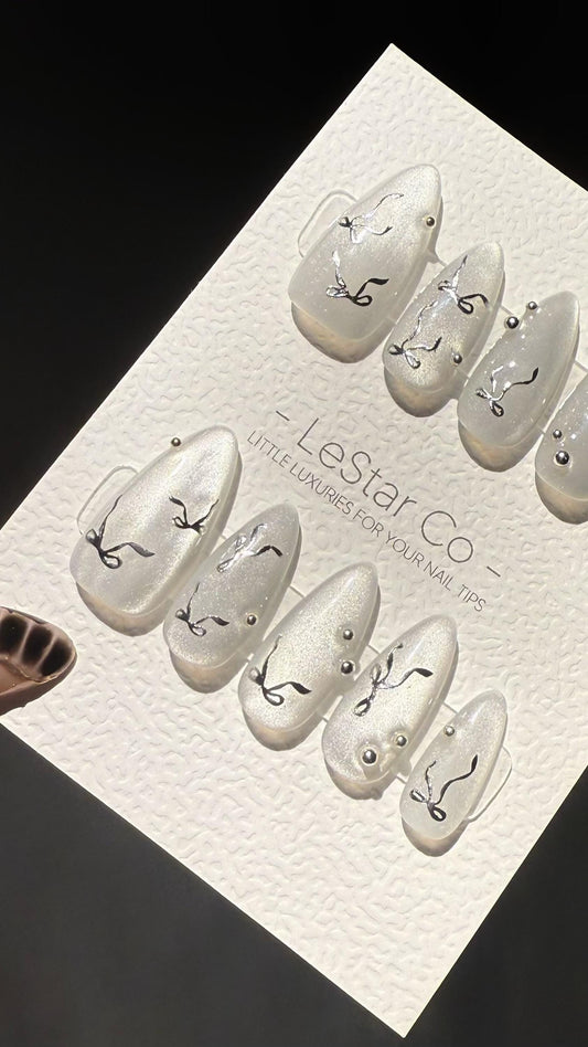 Reusable Shimmering Bows Cat Eye Effect | Premium Press on Nails Gel Hand Painted Pressons Customizable Gel Nail Artist nail WM1003