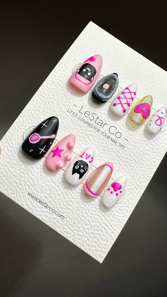 Reusable Black Pink Kitty Robot | Premium Press on Nails Gel Manicure | Fake Nails | Handmade | Artificial nails YR764