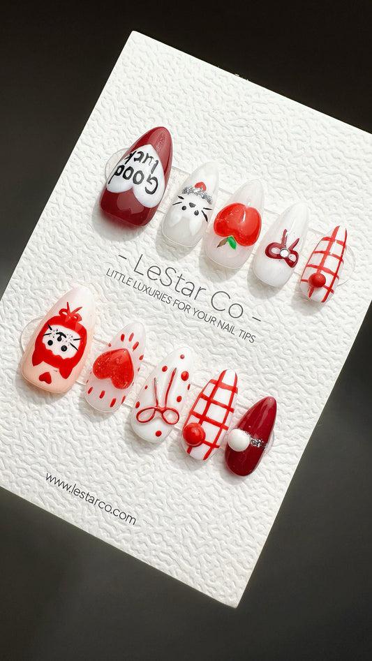 Reusable Good Luck Apple Kitty Cat | Premium Press on Nails Gel Manicure | Fake Nails | Handmade | Artificial nails YR765
