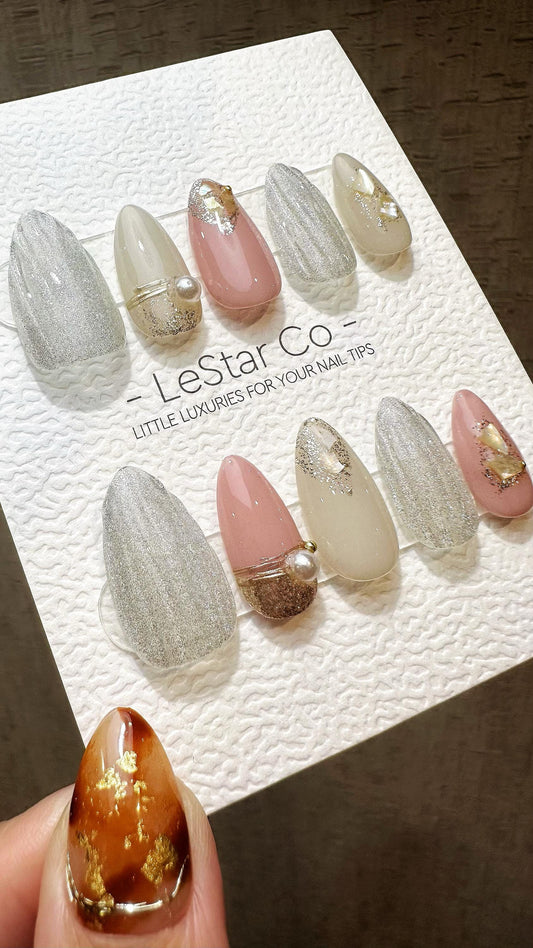 Reusable Pearl Rose Cat Eye Effect | Premium Press on Nails Gel Hand Painted Pressons Customizable Gel Nail Artist faux nails ML806