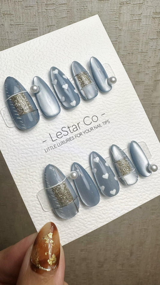 Reusable Silver Serenade Cat Eye Effect | Premium Press on Nails Gel Hand Painted Pressons Customizable Gel Nail Artist faux nails WM941