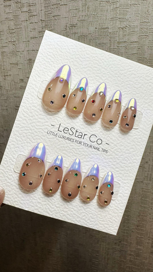 Reusable Iridescent Jewel Glow French Tip | Premium Press on Nails Gel Hand Painted Pressons Customizable Gel Nail Artist faux nails QN954