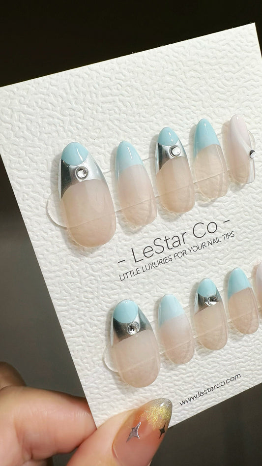 Reusable Silver Lagoon l White French Tip | Premium Press on Nails Gel | Fake Nails | Cute Colorful Gel Nail faux nails TMR642