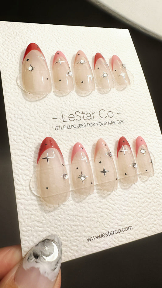 Reusable Pink French with Silver Star | Premium Press on Nails Gel | Fake Nails | Cute Fun Colorful Gel Nail Artist faux nails TMR524