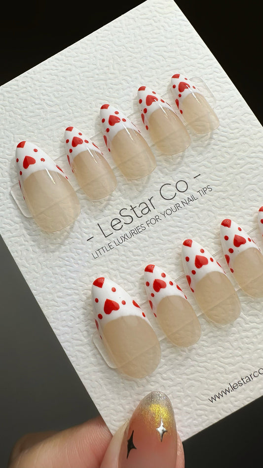 Reusable Many Many Hearts White French Tip Premium Press on Nails Gel | Fake Nails | Cute Fun Colorful Gel Nail Artist faux nails YR571