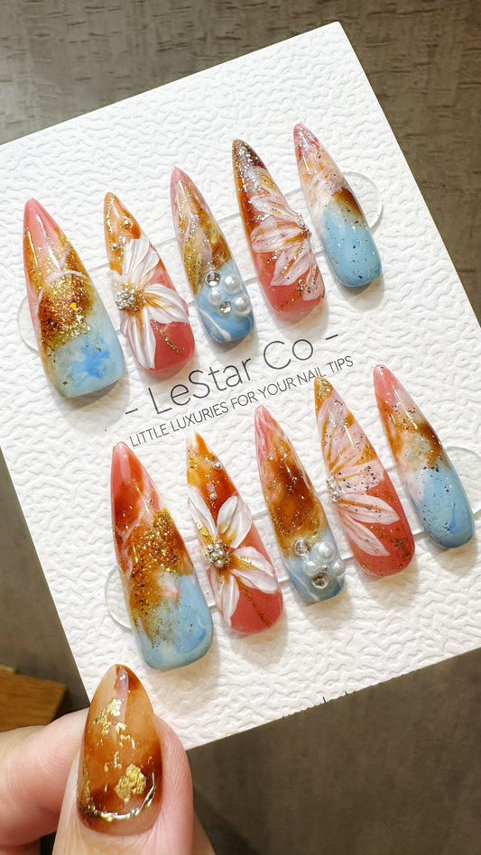 Reusable Coastal Sunrise| Premium Press on Nails Gel Hand Painted Pressons Customizable Gel Nail Artist faux nails WY824