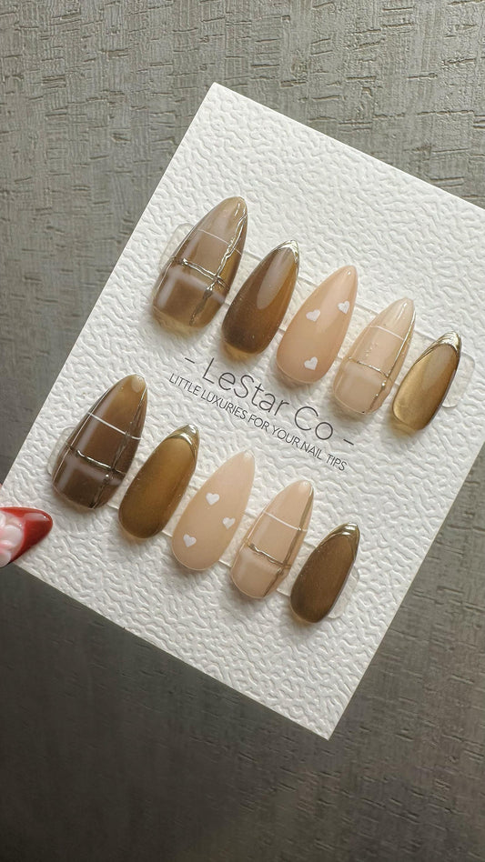 Reusable Toffee Heart Charm Cat Eye Effect| Premium Press on Nails Gel | Fake Nails | Cute Fun Colorful Gel Nail faux nails WM986