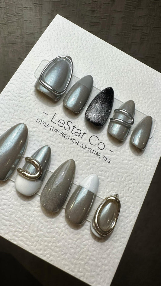 Reusable 3D Moonlit Charcoal Metallic Grey | Premium Press on Nails Gel | Fake Nails | Cute Fun Colorful Gel Nail Artist faux nails TMR827