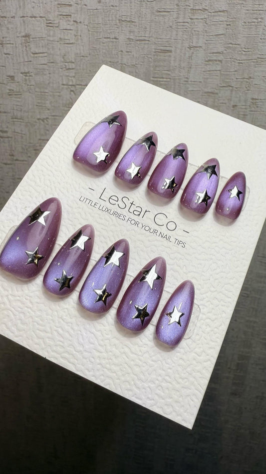 Reusable Cosmic Pulse Purple Cat Eye Effect| Premium Press on Nails Gel Hand Painted Pressons Customizable Gel Nail Artist faux nails WM1013