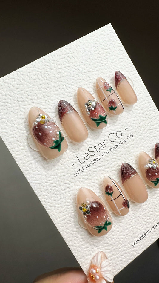 Reusable Jewel Strawberry Cat Eye Effect | Premium Press on Nails Gel Hand Painted Pressons Customizable Gel Nail Artist fake nails YR769